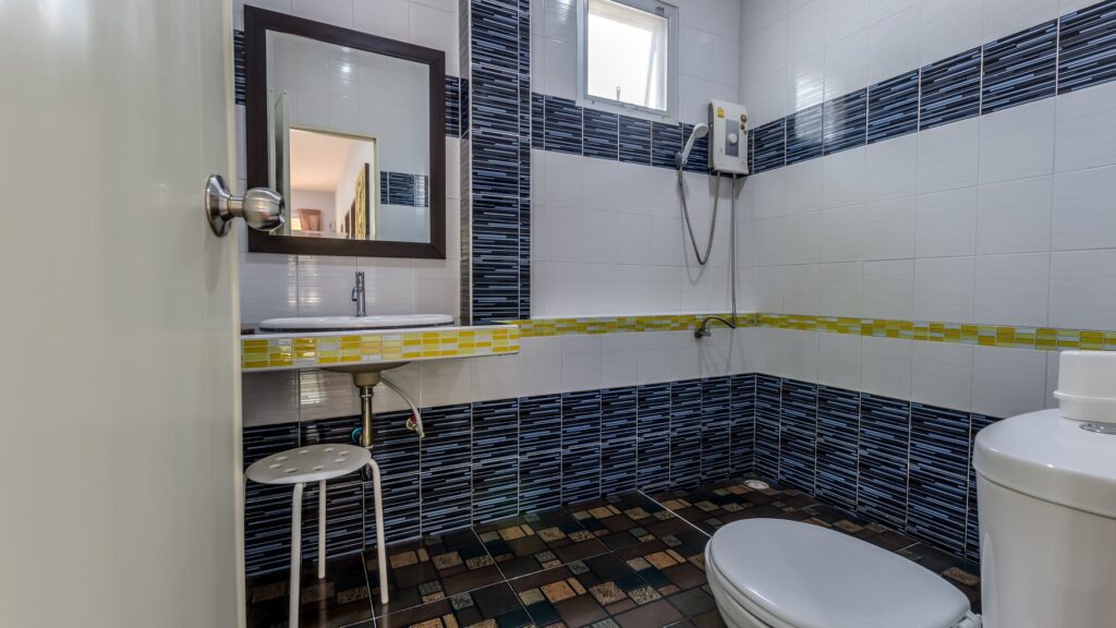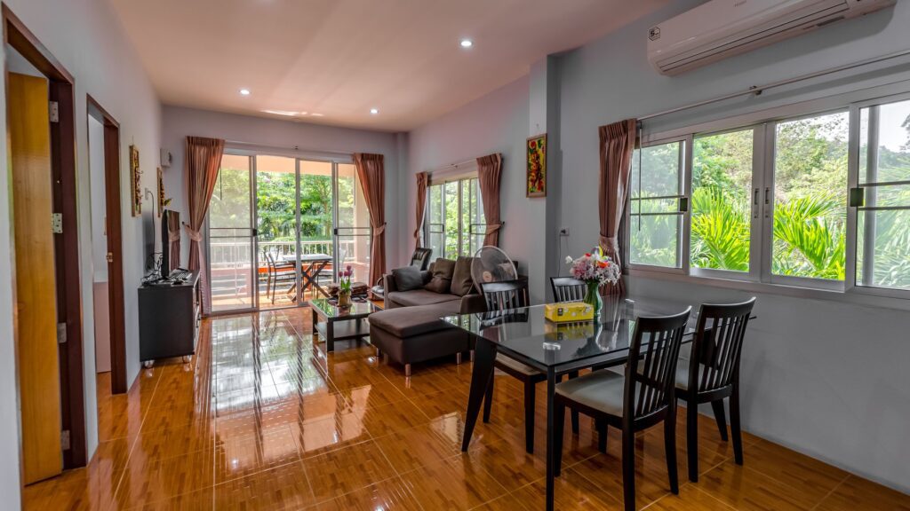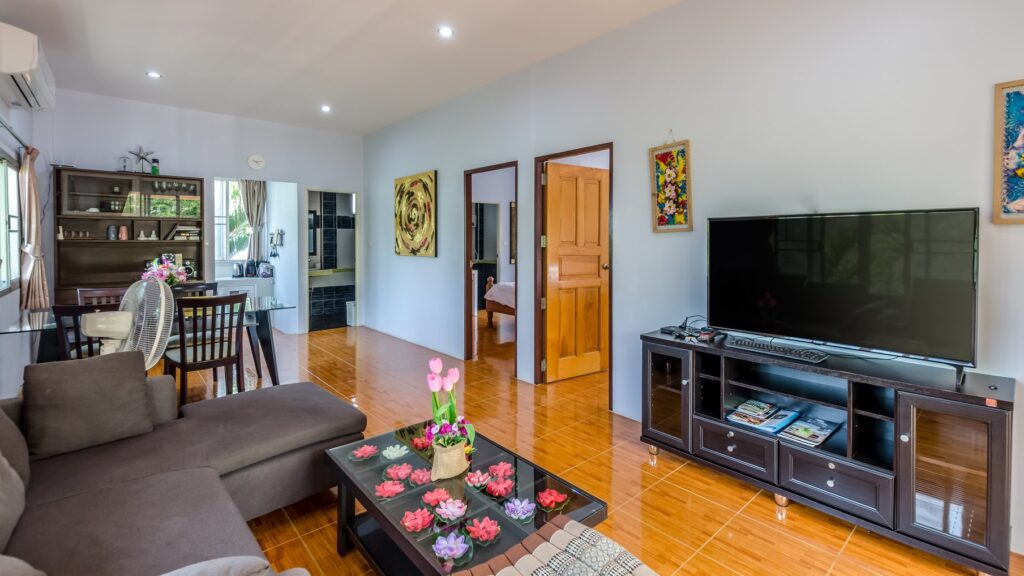 • Living room with 1 large aircon, big smart TV with free Netflix, fan, safe